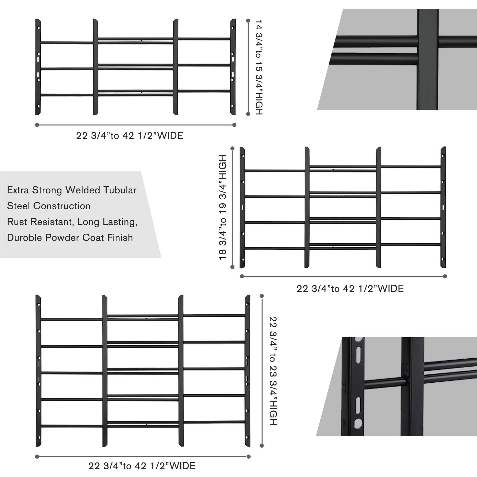 - Department of Health Solid and tubular steel construction Tamper resistant safety installation screws included Window safety stops included for enhanced safety Width adjusts from 22-3/4 in. to 36-1/2 in. fully extended Code regulated 3-1/2 in. bar spacing