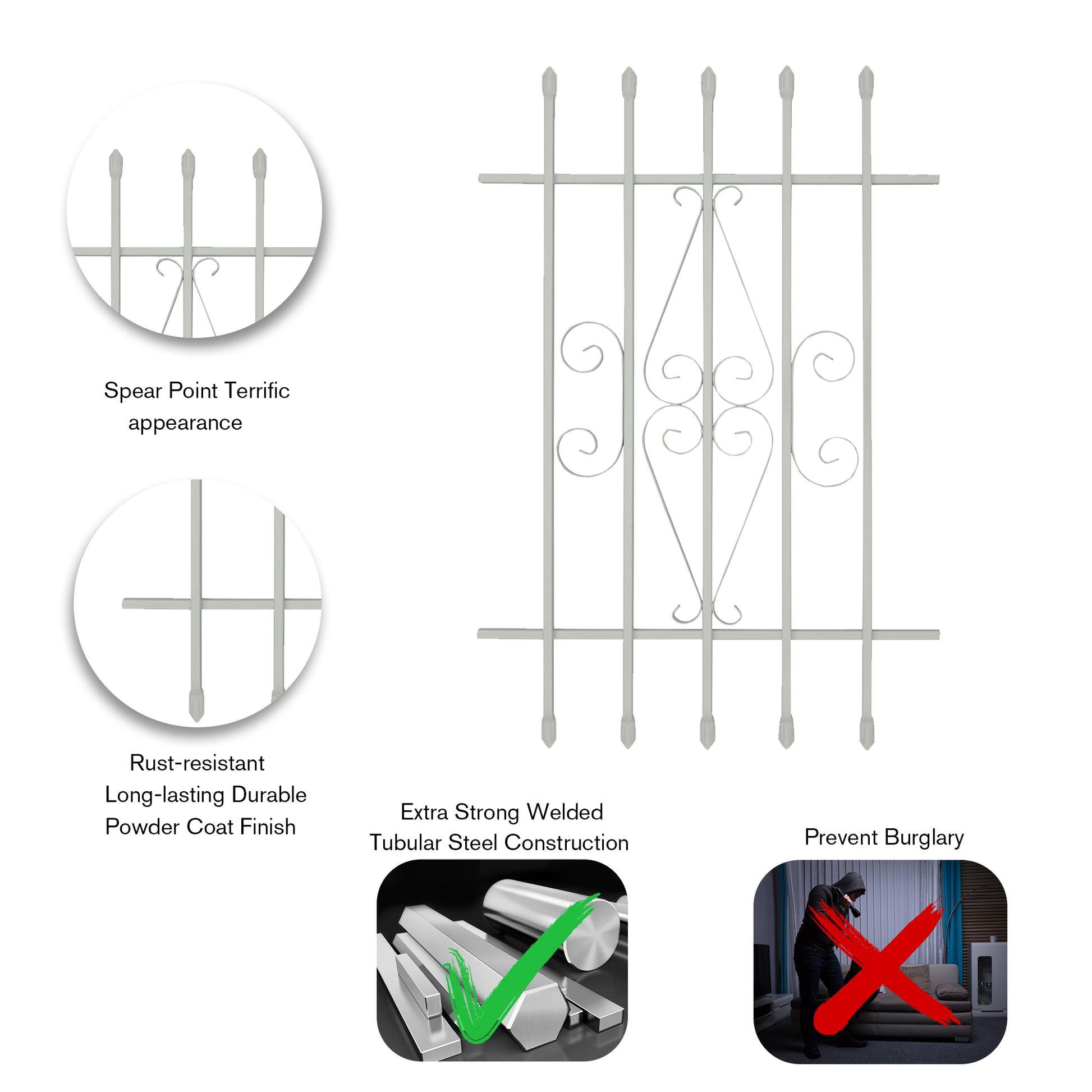 The 42 in. x 42 in. black/white, Spear Point Window Bar is engineered from 1/2 in. welded tubular steel for strength and added security against forced entry.